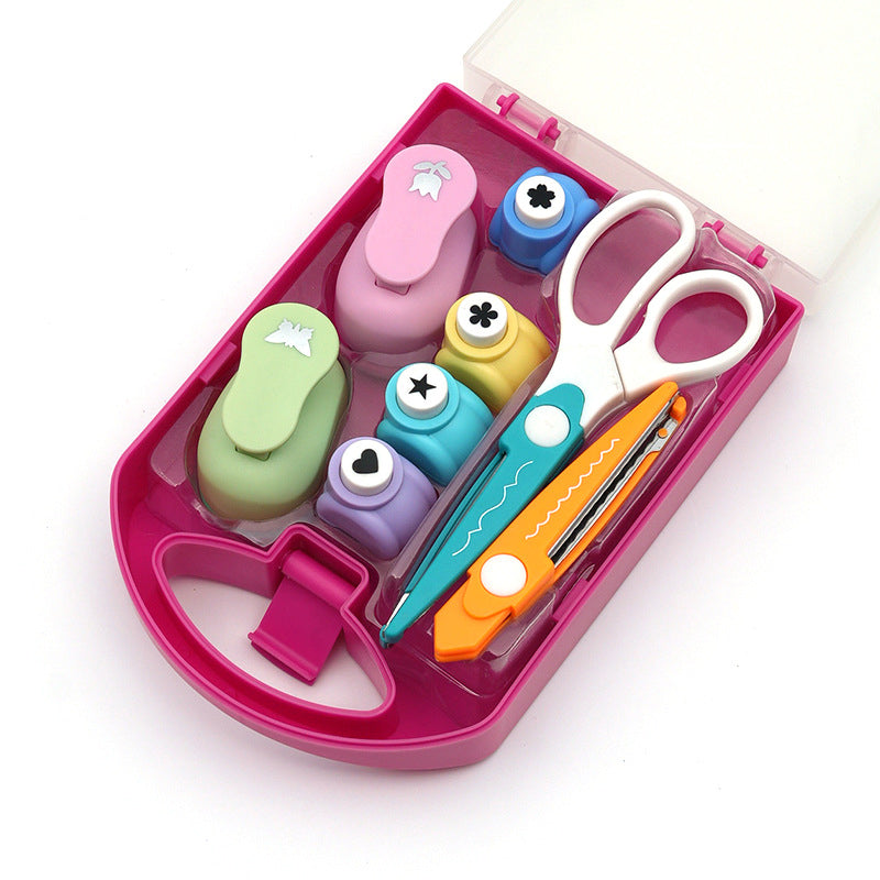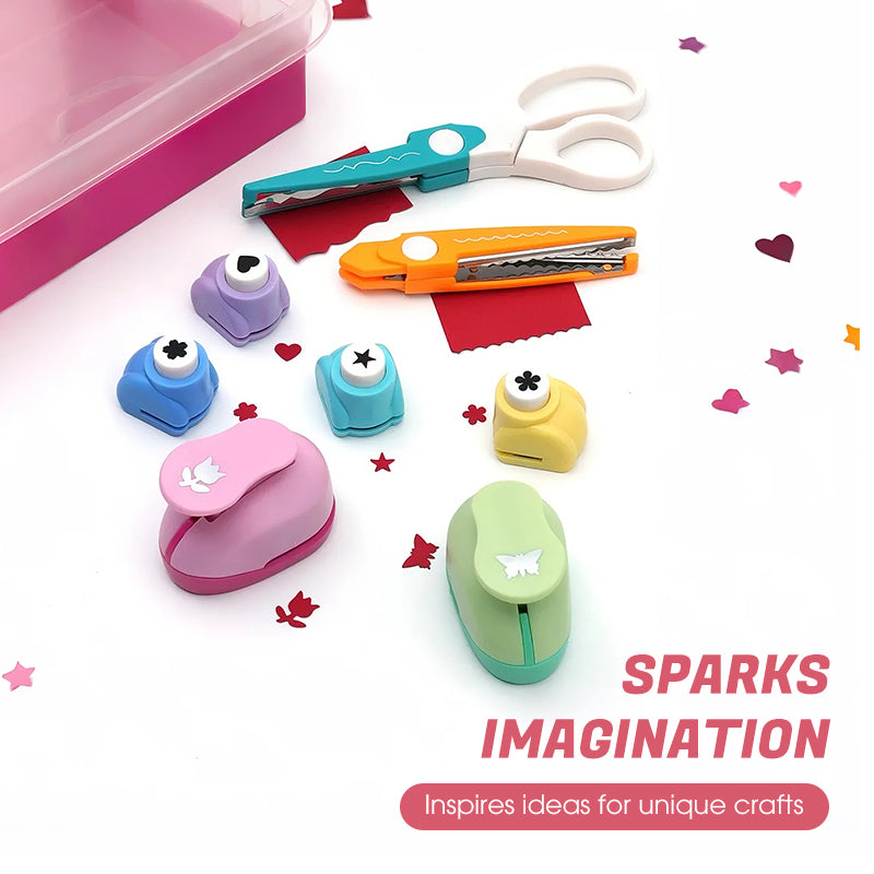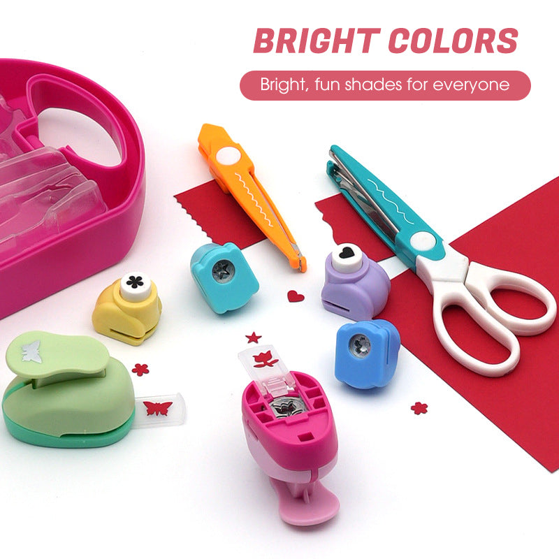 Żywe kolory i uporządkowane przechowywanie- Narzędzia mają jasne odcienie różu, niebieskiego, żółtego i zielonego, co sprawia, że są atrakcyjne dla dzieci, a jednocześnie odpowiednie dla nastolatków i dorosłych. Wszystkie narzędzia można schludnie przechowywać w kompaktowym etui, dzięki czemu dziurkacze i nożyczki są uporządkowane i łatwe do przenoszenia. Niezależnie od tego, czy chodzi o spotkania rzemieślnicze, warsztaty czy inne okazje, można je łatwo przenosić bez obawy o zgubienie części.